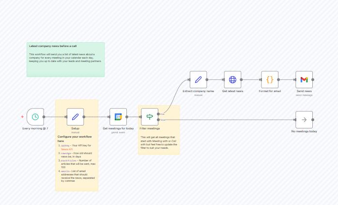 It’s very important to come prepared to Sales calls. This often means a lot of manual research about the person you’re calling with. This workflow delivers the latest news about businesses you are about to interact with each day.