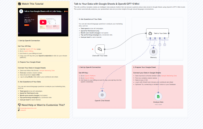 This n8n workflow template creates an intelligent data analysis chatbot that can answer questions about data stored in Google Sheets using OpenAI’s GPT-5 Mini model. The system automatically analyzes your spreadsheet data and provides insights through natural language conversations.